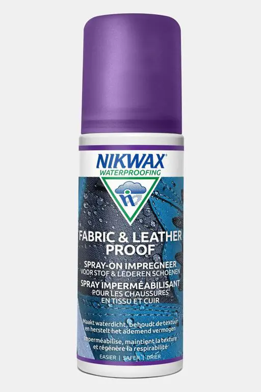 Nikwax Fabric & Leather Proof spray Voor het waterafstotend maken van stof en leer in handige spray. Niet brandbaar en PFC-vrij. Aanbevolen voor Gore-Tex® en eVent®, Sympatex ® en alle andere waterafstotende stof en leren schoenen.