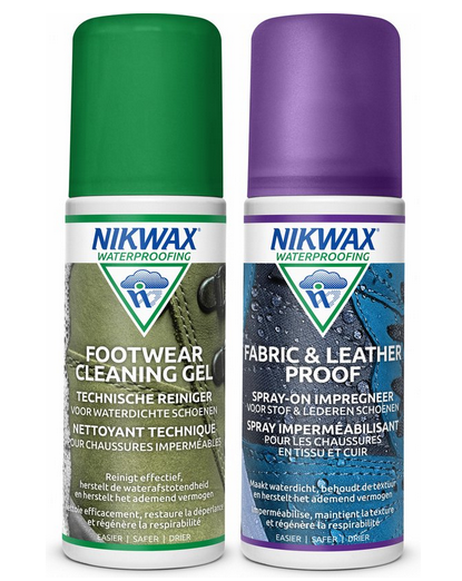 Nikwax footwear cleaning gel & Fabric&Leather proof Dit duopack van een cleaning gel en waterproofer biedt een gemakkelijke manier van het onderhoud van je schoenen. De cleaning gel is de eerste stap: deze technische reiniger verwijdert vuil met de borstelkop en gel en herstelt de ademende werking van de schoen. De vervolgstap is de fabric & leather proof met spons applicator voor gebruik op stof en/of leder. Dit impregneermiddel voegt waterafstotend vermogen toe, zonder het ademende vermogen aan te tasten. Niet vlambaar en PFC-vrij. Aanbevolen voor elk type waterafstotend schoeisel zoals; Gore-Tex® and eVent®, Sympatex ®