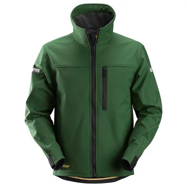 Snickers allroundwork softshell jack kleur bosgroen/zwart Winddicht en waterafstotend. De jas heeft voorgebogen mouwen dat zorgt voor maximale bewegingsvrijheid. De achterkant van de mouwen is verlengd, zodat elke positie van de arm bescherming heeft zonder prestaties te beïnvloeden. Reflecterende details zorgen voor betere zichtbaarheid en veiligheid. Materiaal: Winddicht, waterafstotend en ademend softshell materiaal, 100% Polyester 265g/m². Cordura® verstevigingen 100% Polyamide 205g/m².