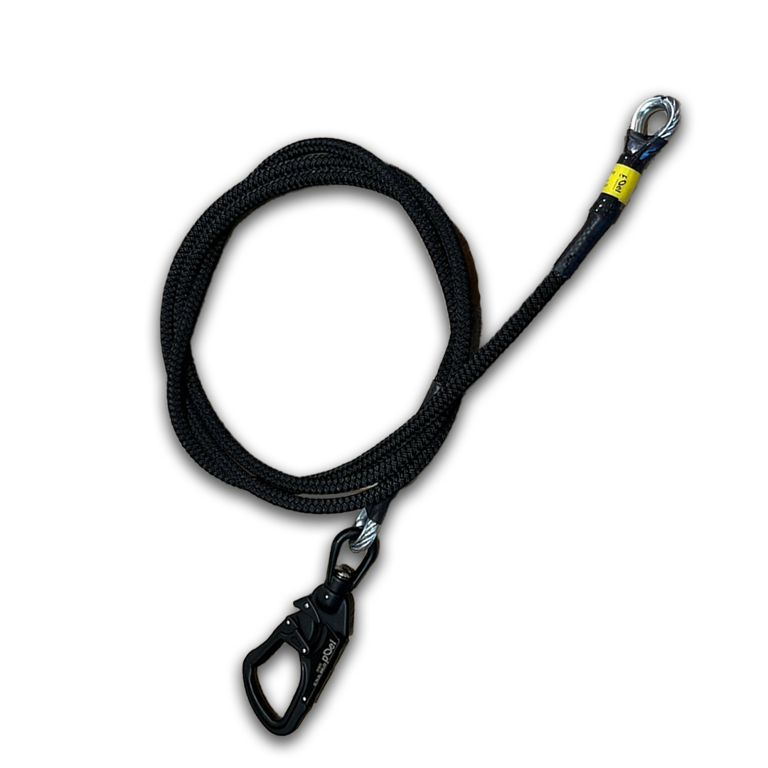 Poel safetystrop met snaphook karabiner De Poel fliplijn met stalen kern meet een werklengte van 3.2 meter, een snaphook karabiner van ISC aan de ene kant en een oog aan de andere kant. Ideaal voor het werken op sporen bij het afbreken van bomen. Deze safetystrop heeft geen ropegrab (daarvoor is artikelnummer 6024).