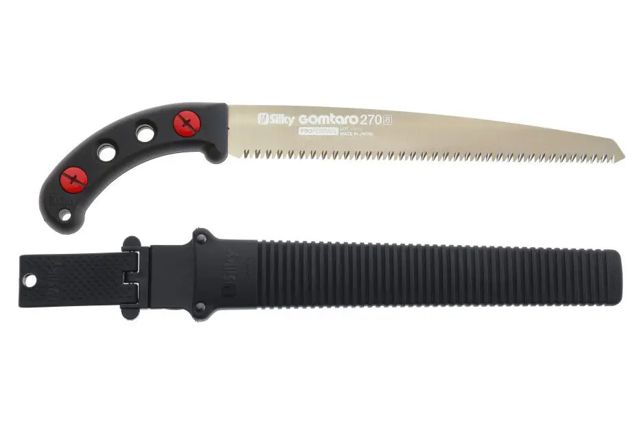 Silky Gomtaro De Gomtaro, basisserie van de Silky snoeizagen met recht zaagblad, wordt wereldwijd door professionals gezien als onmisbaar onderdeel van de basisuitrusting. Het geavanceerde ontwerp van de Mirai-Me vertanding, de tanden zijn in de bladdikte ingeslepen, er is geen tandzetting, zorgt ervoor dat u moeiteloos door het hout zaagt met een zeer gladde afwerking van de zaagwond tot gevolg. Het uit een speciale staallegering gemaakte blad bestaat uit één geheel en loopt door in het handvat wat ervoor zorgt dat de Gomtaro lang scherp blijft en een perfect balans heeft. Het blad is voorzien van een hardchromen laag dat beschermd tegen roest en de plakeffecten van hars. Daarnaast zorgt de chroom laag voor een zeer slijtvast oppervlak. Het uit rubber gegoten handvat ligt comfortabel in de hand en reduceert trillingen sterk. De zaag past precies in het op maat gemaakte, zwarte kunststof holster met afneembare riemhouder. Het holster dat aan het been (er zijn speciale Silky leg straps verkrijgbaar) of de riem kan worden bevestigd, heeft onderaan een opening, waardoor vocht en zaagsel uit de holster kunnen wegvloeien. De Gomtaro is verkrijgbaar in vier lengten: 210 - 240 - 270 en 300 mm.